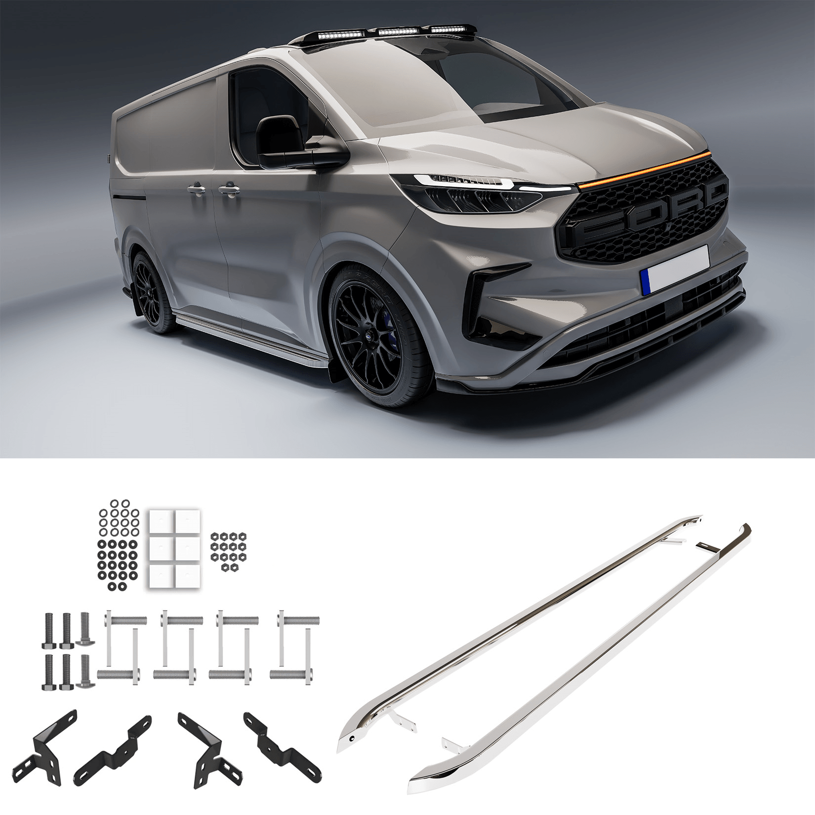 Title: Ford Transit Custom MK2 SWB 2024 On Trapezoid Side Bars In Stainless Steel