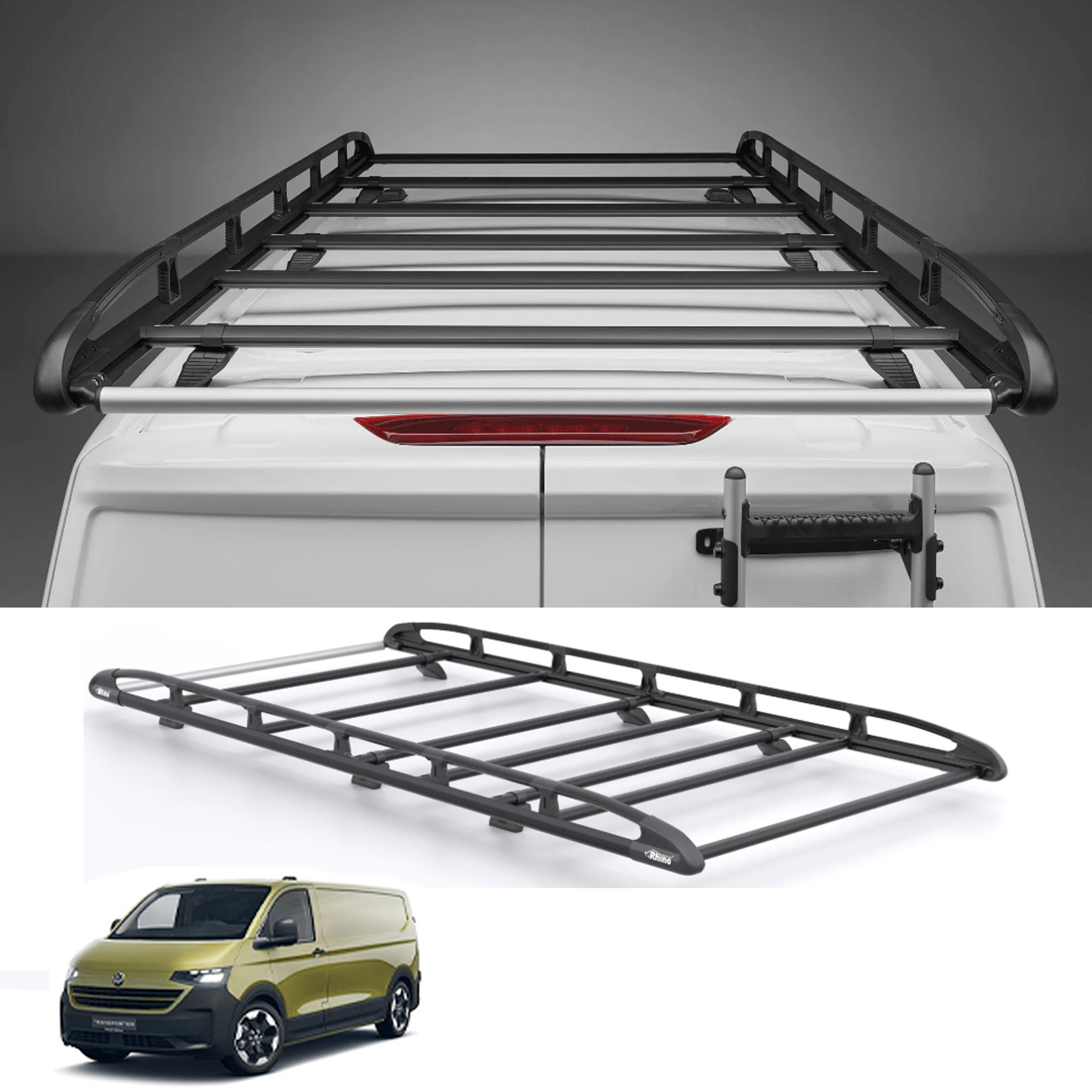 Title: Rhino KammRack Black Aluminium Van Roof Rack - Volkswagen Transporter T7 2024 On SWB Low Roof (L1H1) Tailgate Rear Door
