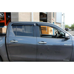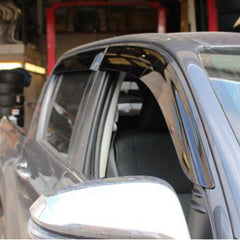 Remove the 3M Adhesive tape and line the deflectors up with the door frame lining up one corner at a time for accurate fitment. When in place press down along the surface of the deflector to hold it in place.